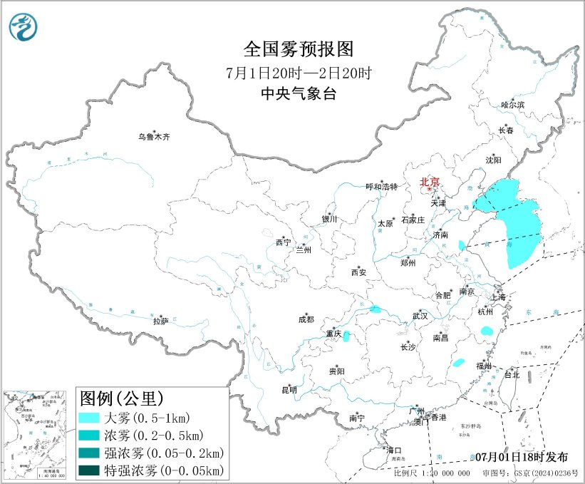 预计,7月1日夜间至2日白天,渤海海峡、黄海北部和东部海域、成山头附近海域、烟大航线、大连港、烟台港将有能见度不足1公里的大雾。